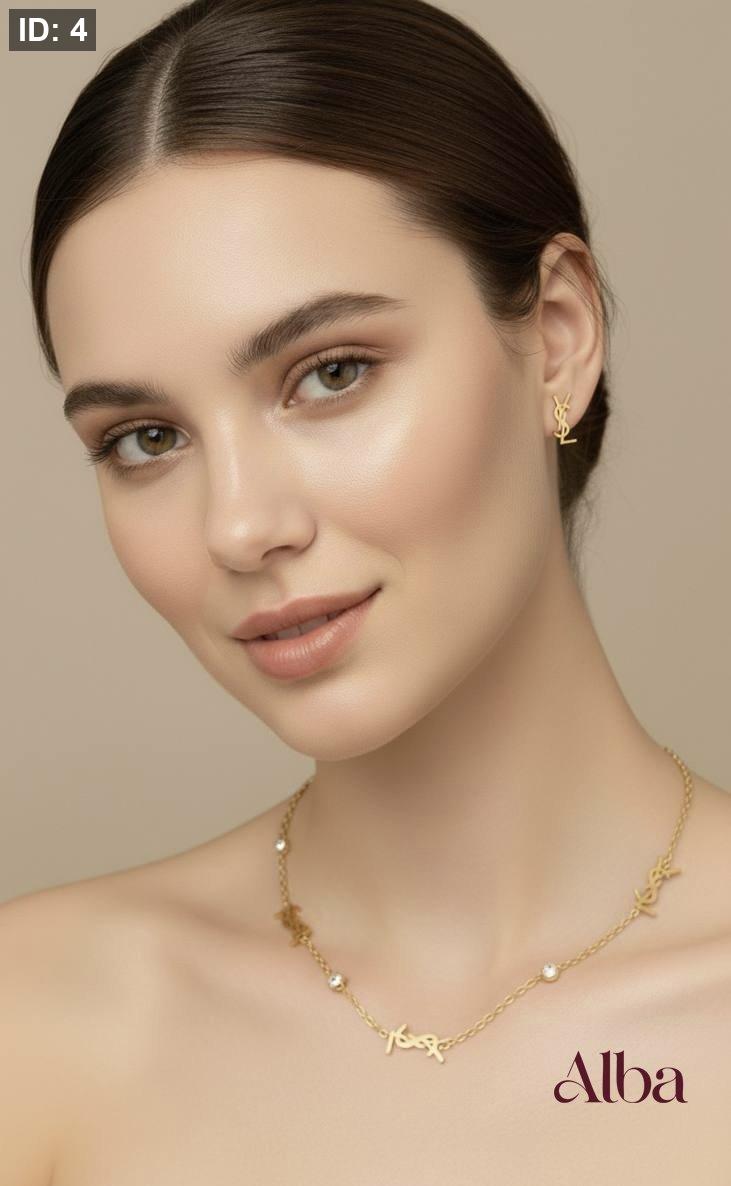 طقم YSL الفاخر، مكون من عقد و حلق بالون الذهبي المكفول اللون لا يخرب أو يتغير، مقاوم للصدأ والتآكل، ومناسب للاستخدام اليومي. قطعة مثالية لإضافة لمسة فاخرة وجريئة لإطلالتك اليومية أو المسائية.
